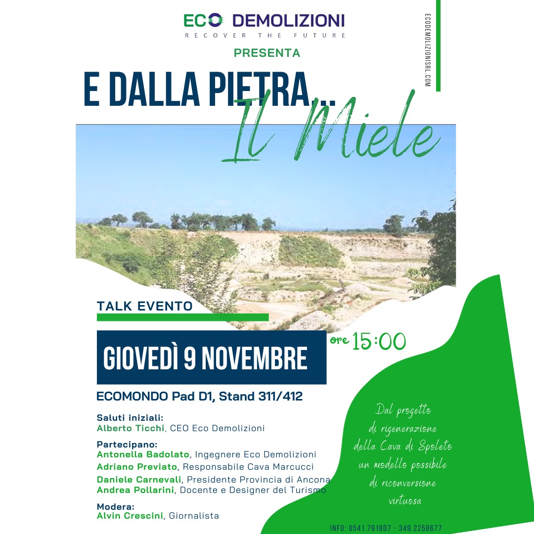 Dal progetto di rigenerazione della Cava ex-Marcucci di Spoleto, abbiamo creato un modello di riconversione virtuosa replicabile anche in altri siti. Ne parleremo insieme, ad Ecomondo, nel talk ‘E dalla pietra…il miele’, l’evento che come Eco Demolizioni abbiamo pensato per il nostro esordio in questa importante manifestazione. Sarà un appuntamento per fare il punto sulle migliori pratiche di rigenerazione e riqualificazione dei territori interessati dalla coltivazione di cave. Lo faremo con tecnici, esperti, istituzioni e docenti, partendo proprio da quella che è la nostra esperienza nella cava di Spoleto, dove abbiamo dato vita ad una produzione di miele.
