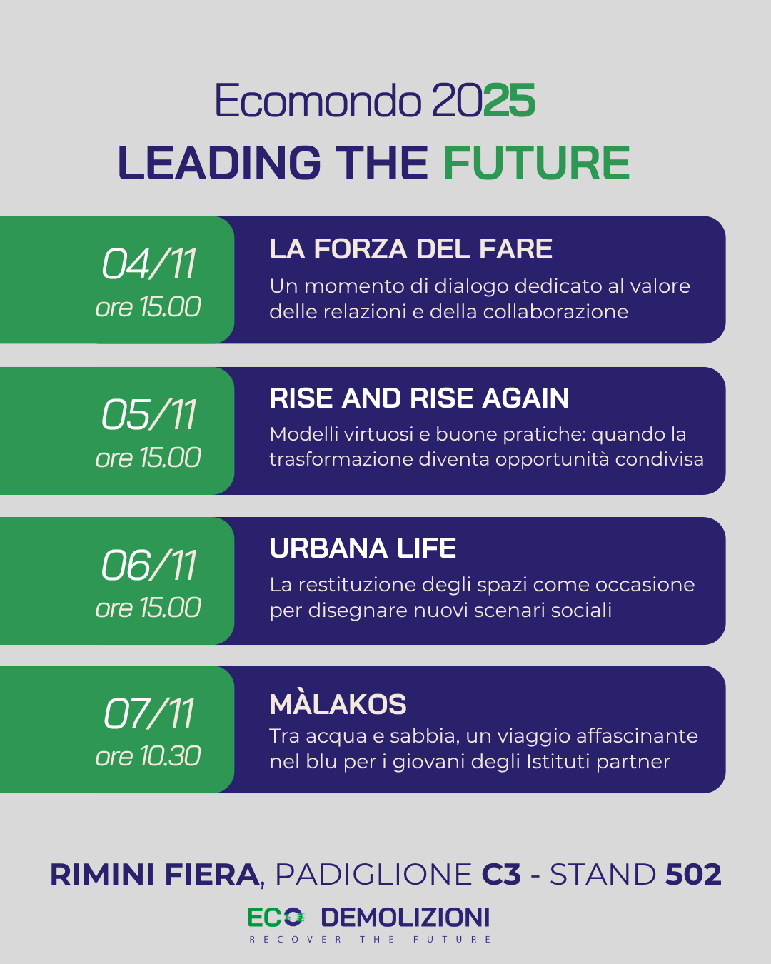 Stiamo scaldando i motori per Ecomondo 2025: per il nostro terzo anno consecutivo ci siamo ispirati al concetto di ‘Leading the future’, perché vogliamo essere sempre più protagonisti del cambiamento con le nostre azioni, le nostre idee e i nostri network. Qui trovate i primi Save the date per i nostri 4 appuntamenti in Fiera a Rimini, dal 4 al 7 novembre. Vi aspettiamo.
